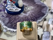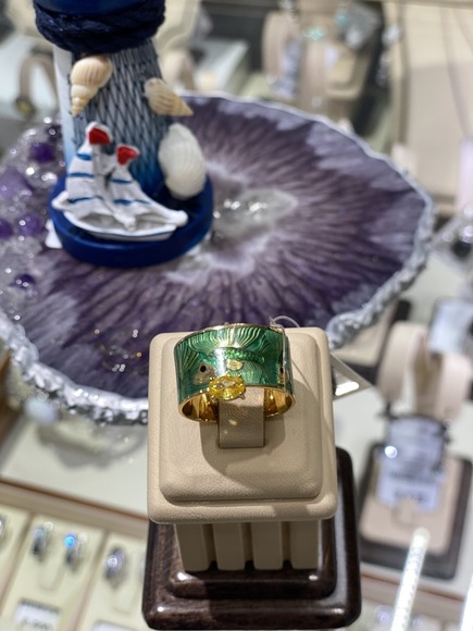 Кольцо "Рыбка" на зеленой эмали, серебро, с камнем.
